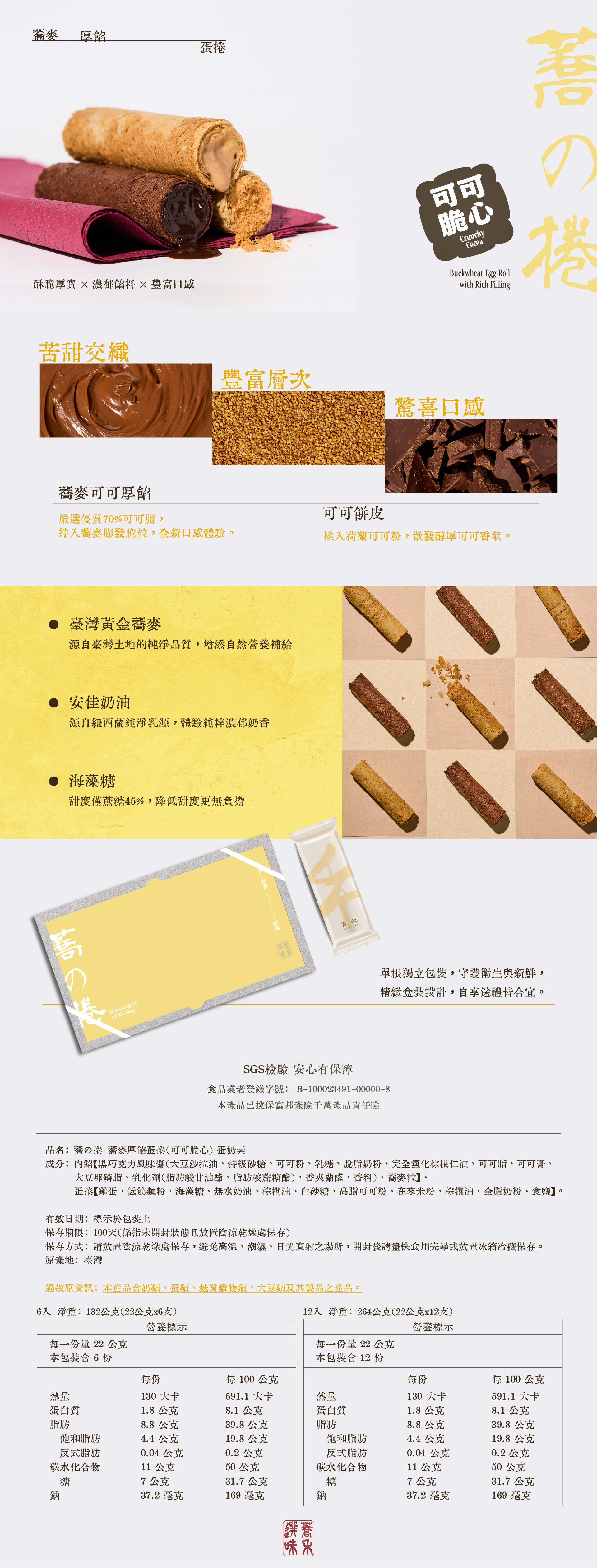 蕎の捲-蕎麥厚餡蛋捲(可可脆心) 蛋奶素 6入/12入